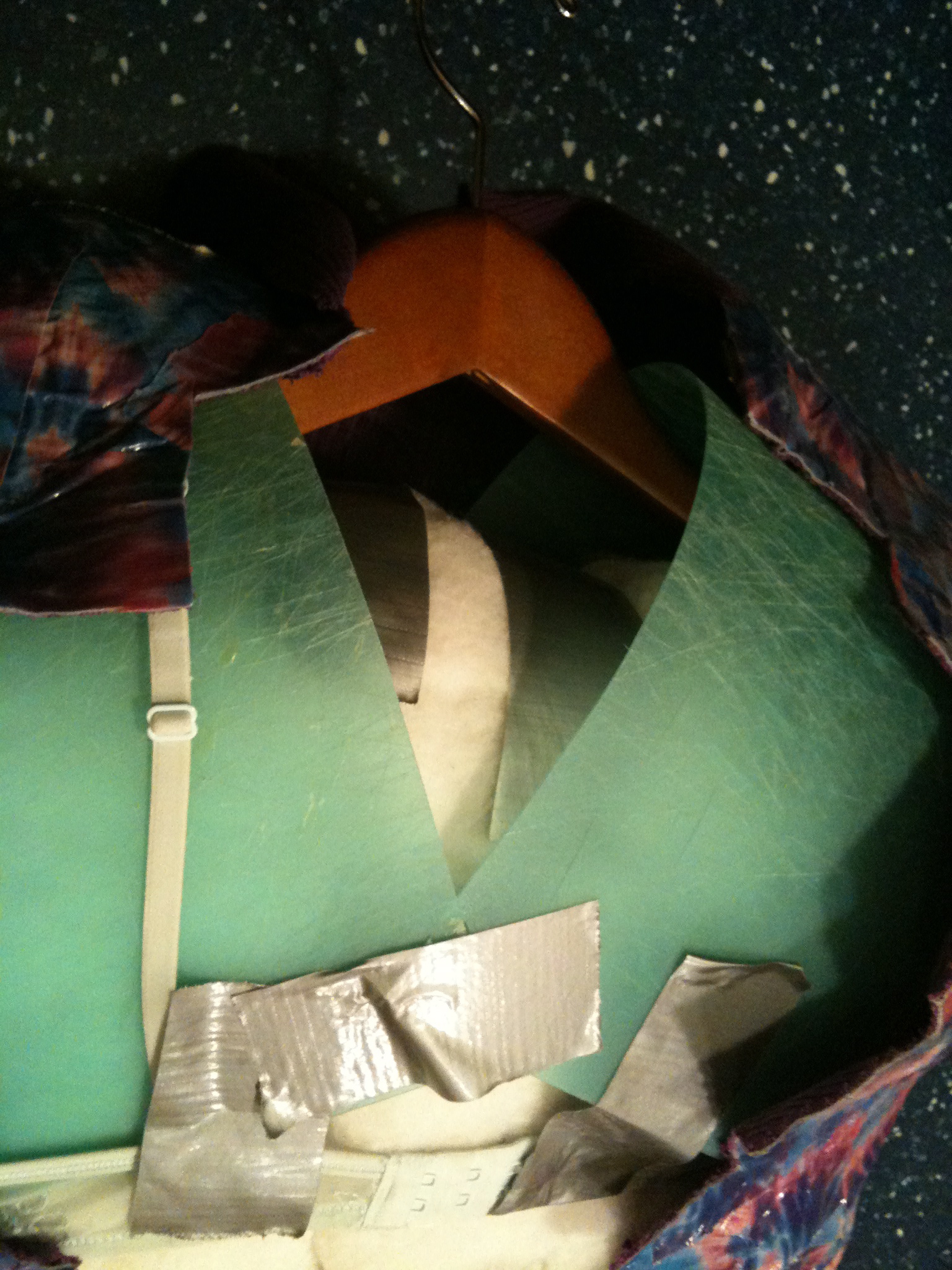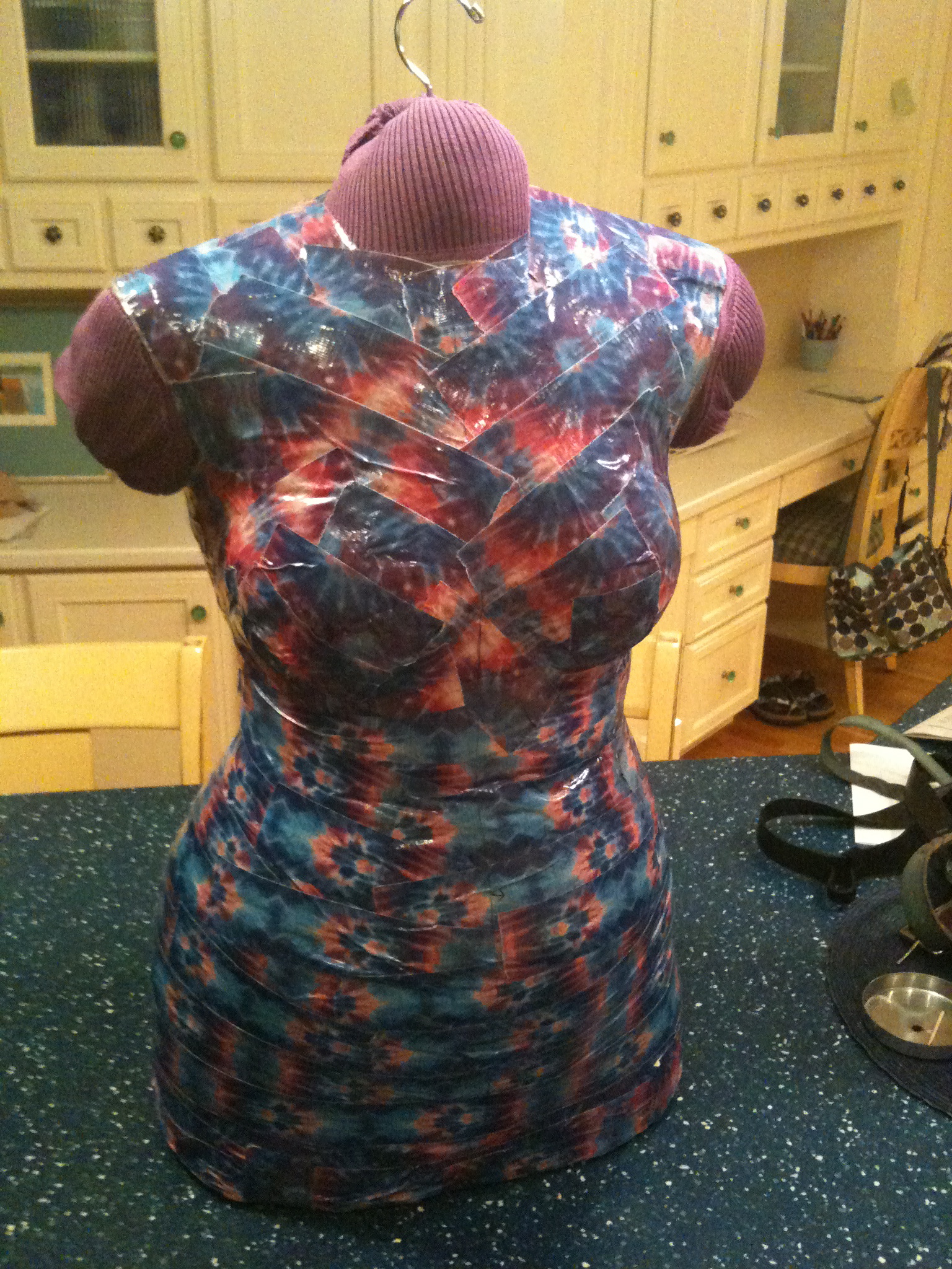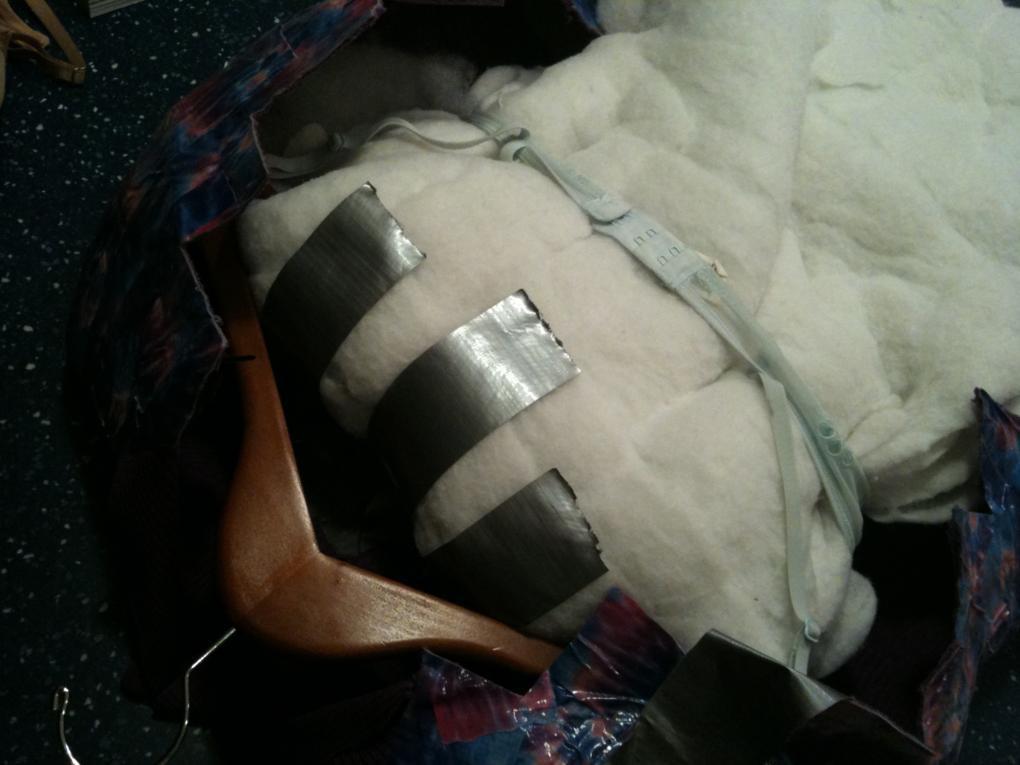 So after the taping is done there’s still work to do. I’ve decided to hang my double instead of putting it on a pole and stand. I wore a long sleeved turtleneck and sewed a length of cotton knit around the bottom to cover my backside. It actually went almost to my knees and came in quite handy.