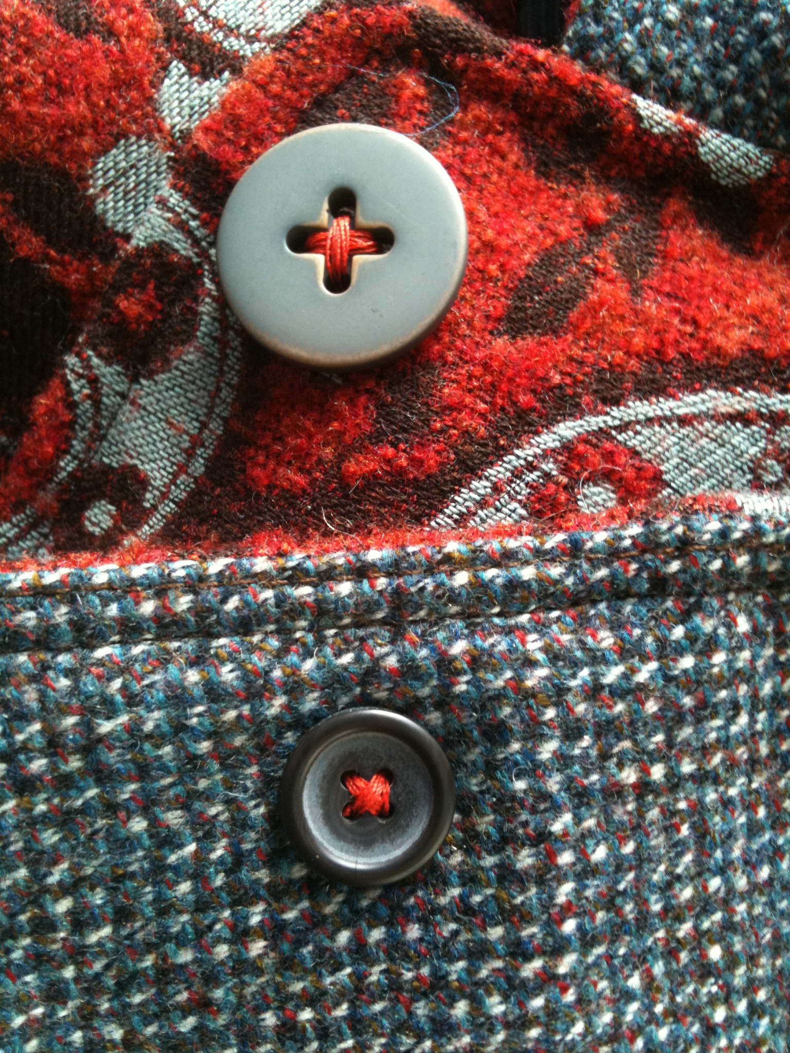 I wanted to sew small buttons to the back side to make the orange thread neater. Anybody know what that small button is called? I didn’t. It’s a backer button. I was worried that the smaller holes wouldn’t match up with the holes of the bigger buttons but it went very smoothly. I also wanted to make a bit of a shank to allow for the thick fabric. I’ve done that before-put a crochet hook between the fabric and button and sew, then take out the hook and wrap thread…but it never seems to be enough to make a shank. But then I consulted with Debbie and she straightened me out-put the crochet hook (or toothpick, etc.) on TOP of the button and sew it on. Oohhhhh! And just in case, I looked it up in Vogue and it was the same as Debbie’s advice. Wonder where my idea came from….