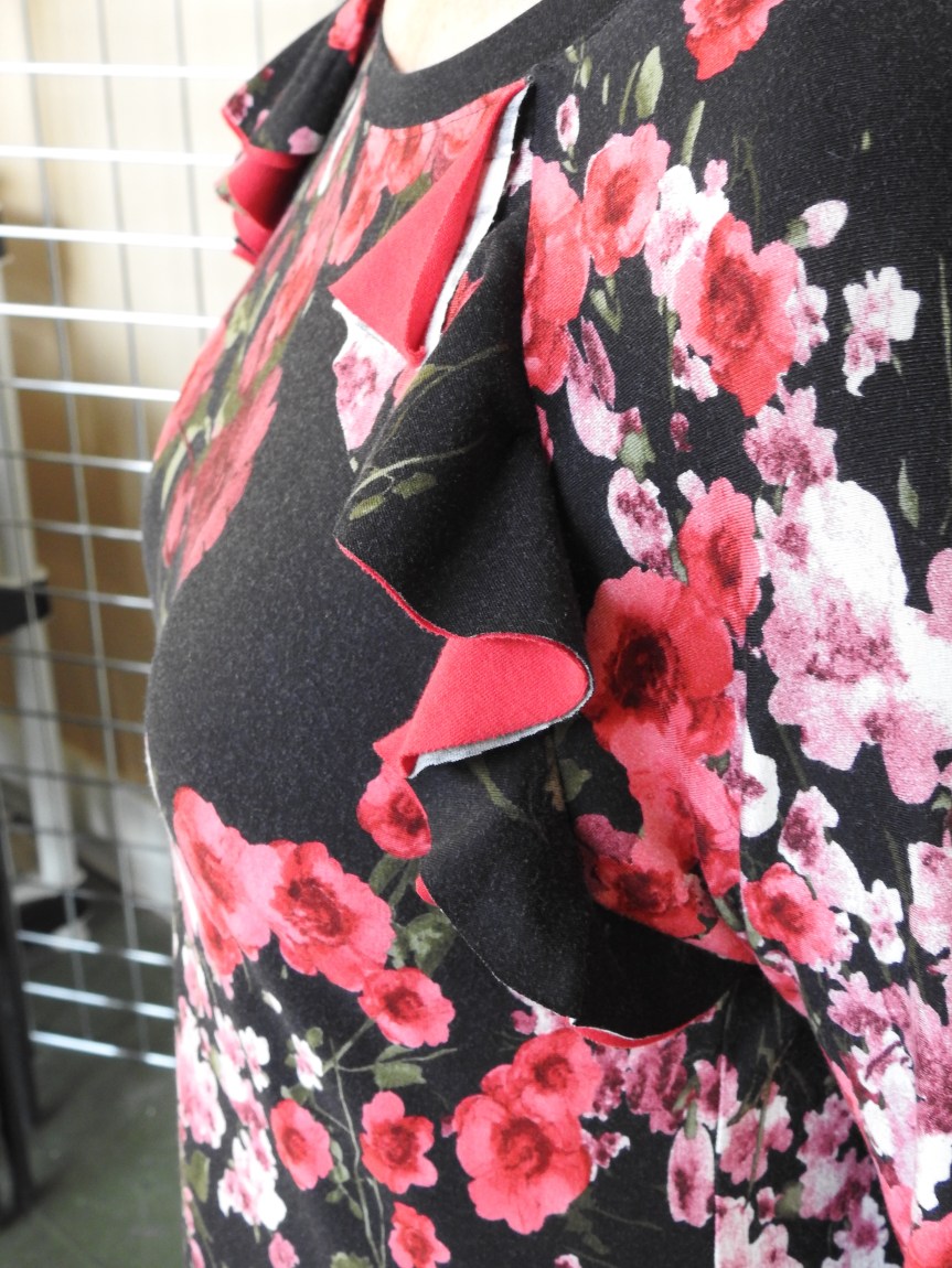 3. Cut two ruffles from main fabric and two from contrast fabric to avoid ws of main fabric showing. Place ws of main fabric ruffle to ws of contrast. Baste ruffles to front at sleeve area.
