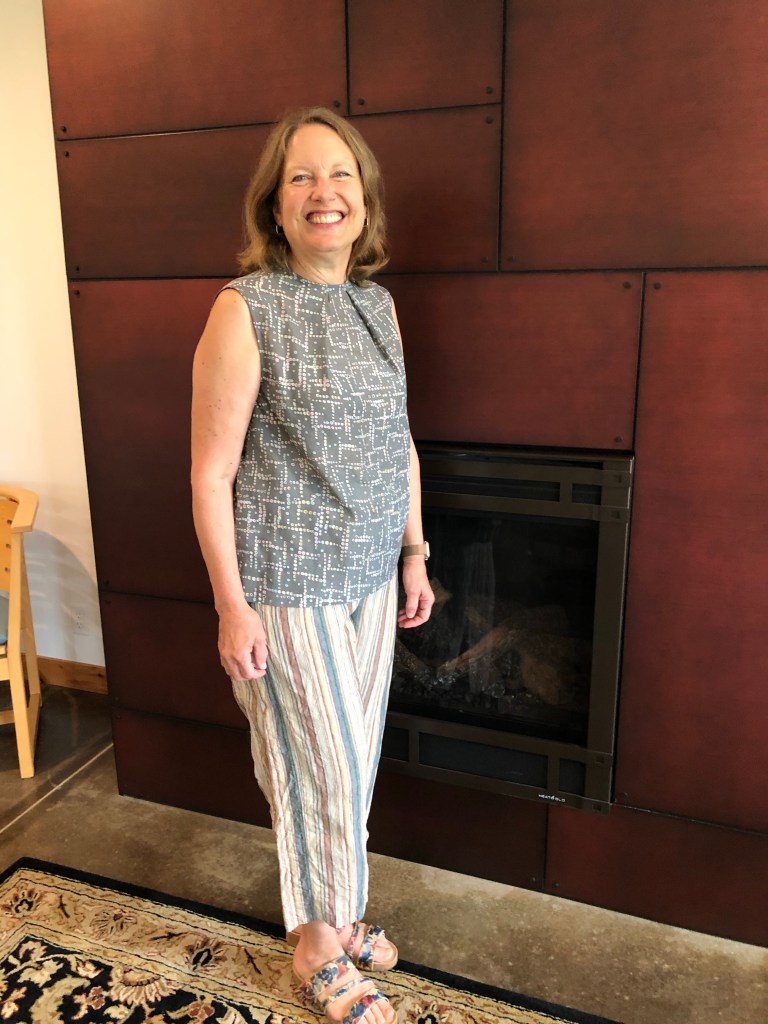 1. This is my fourth make from this pattern and I can see more coming. My first pair was a navy rayon blend made to pattern without cuffs. For May I used a light weight denim with cuffs but did not add draw string. I used a light weight French terry for the third pair. Even though I went down a size a more stable knit like a ponte would be better. I use that make for pj’s-I will stick with wovens from here on out.