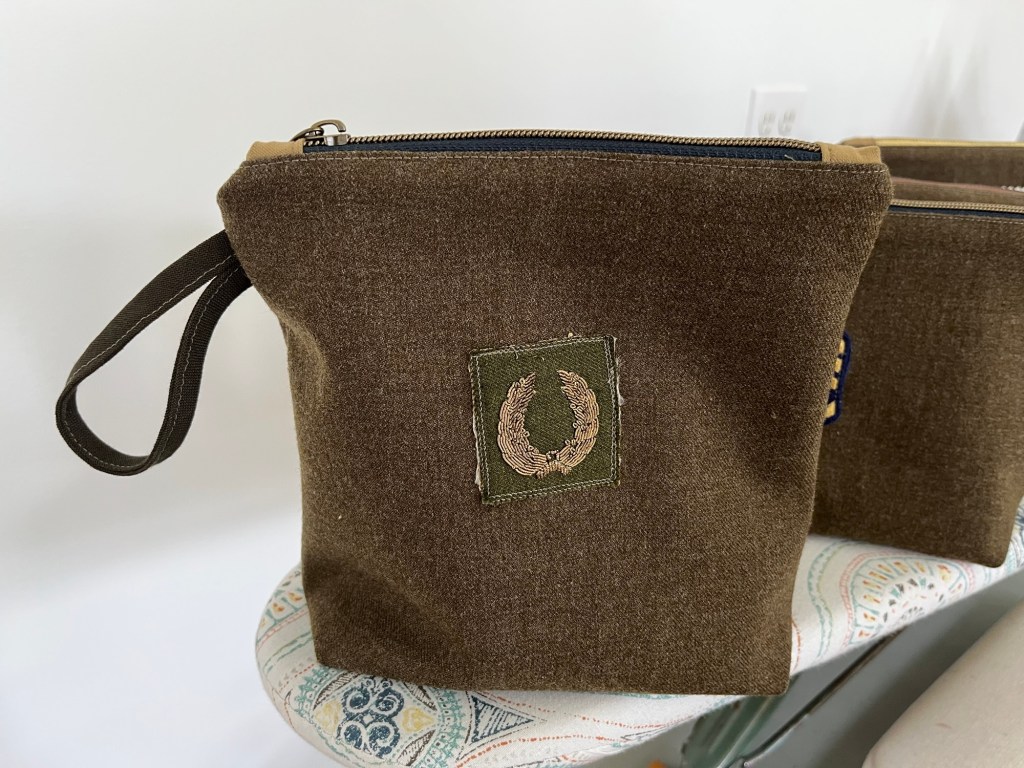 My dad has been gone for a few years now-what to do with his Korean War uniform…No grandchildren wanted it for history reports. The historical society has plenty of them already.So I tried the free Greenstyle Zipper Bag patternFound the perfect thread matchCut out 11 assorted shaped bags and put in zips!!Dad’s March birthday turned in to Easter and summer and finally they were finished at the end of July.Printed on pants pocket liningChest pocket from uniform jacketMade sure every bag had emblems or buttonsThe bag straps were made from the wool uniform tie-all on the bias!The poem I tucked inside each bag-written by my sister