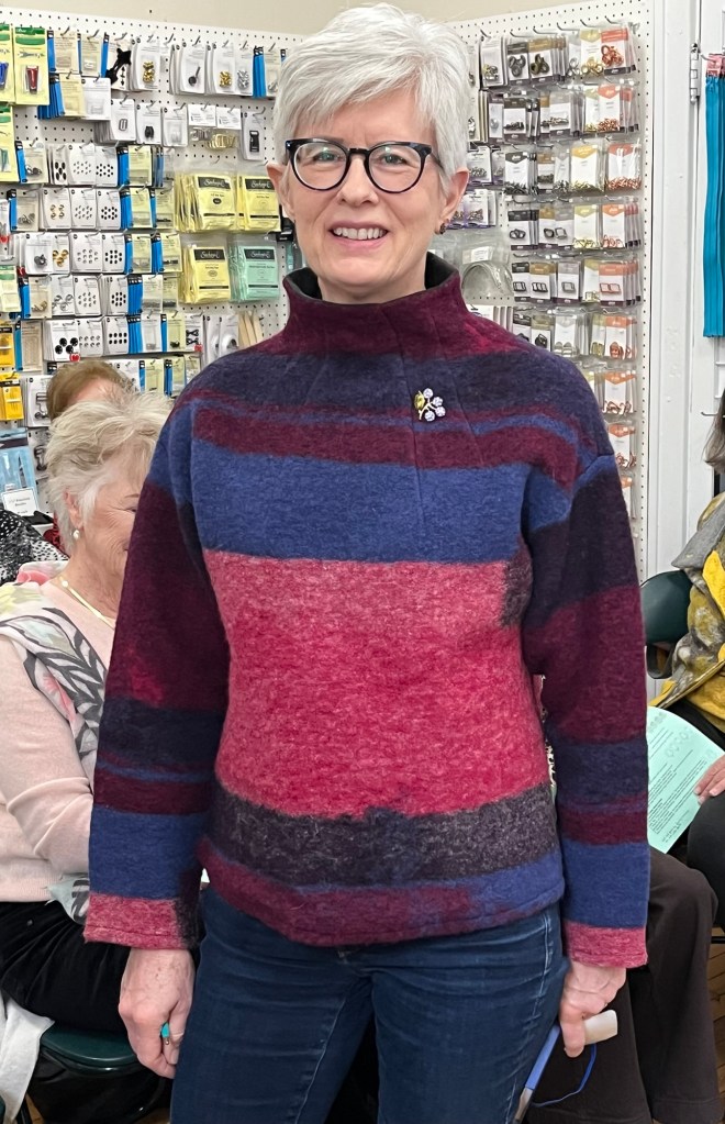 There is a great video tutorial on YouTube for making the sweater. I hand stitched the “rolled hem” on the collar. Looks nice but you have to get close 🙂