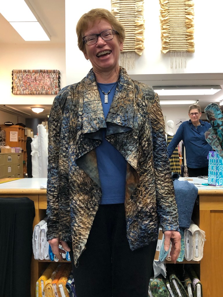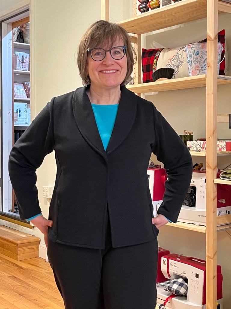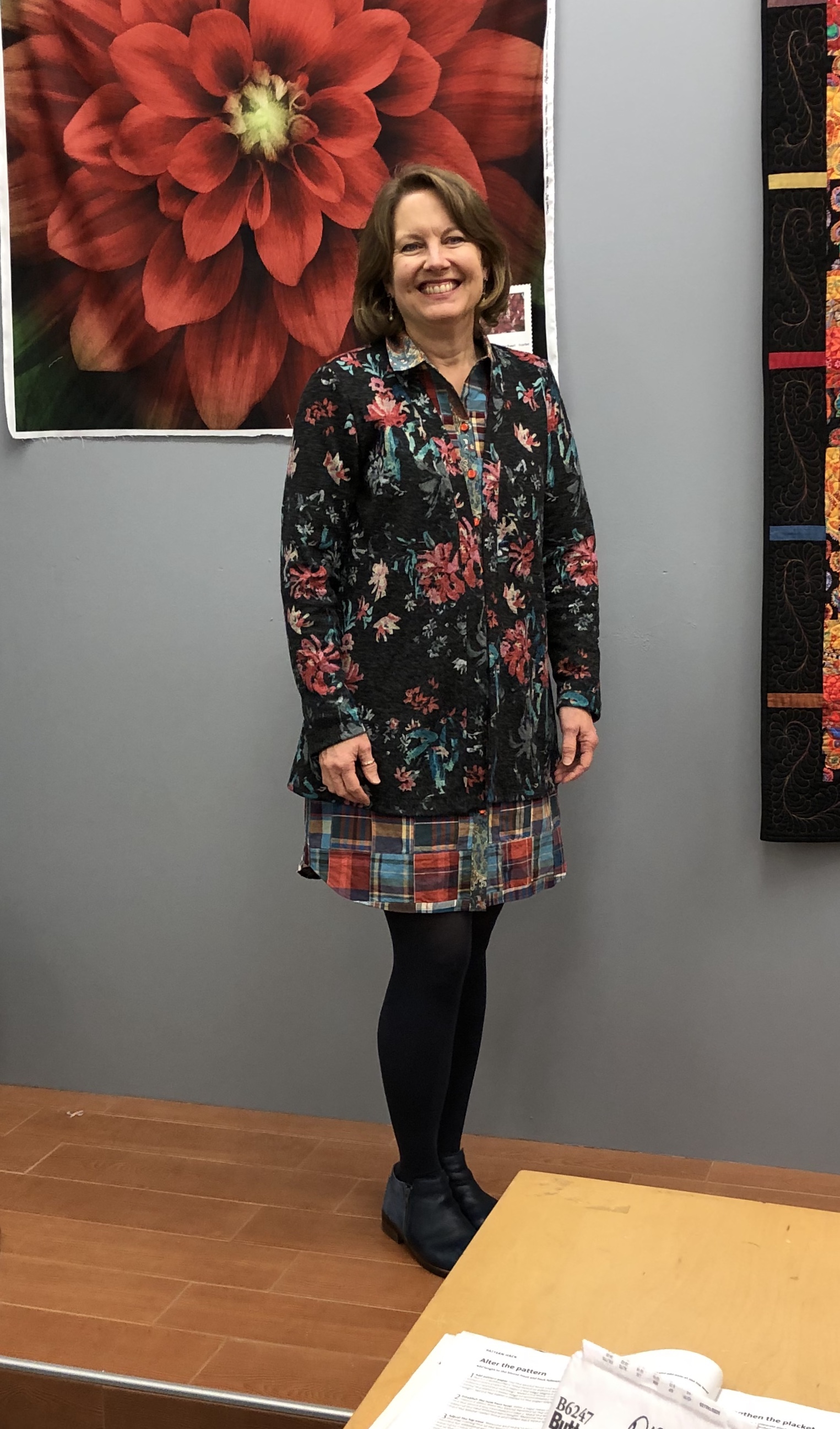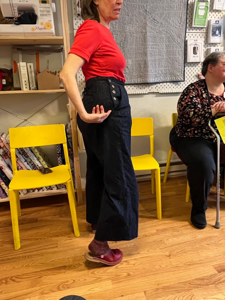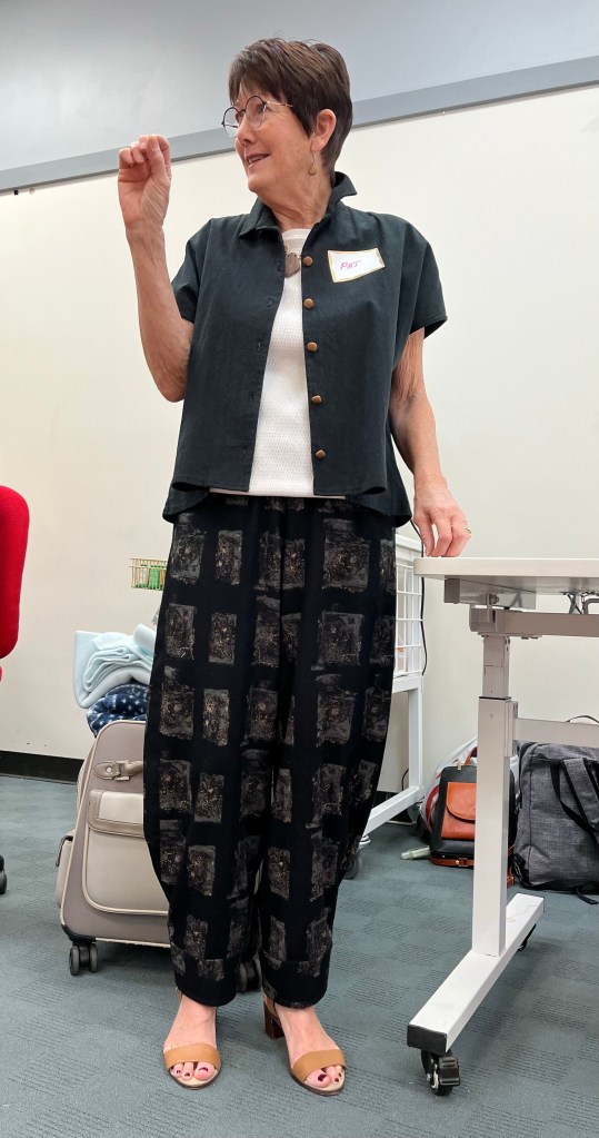 2. The pattern – There are two back designs. One has a yoke and pleats, the other is a full back. The directions are clear and concise and the construction is all done by machine – no slip stitching. I feel the pattern runs small in size, especially in hip area.