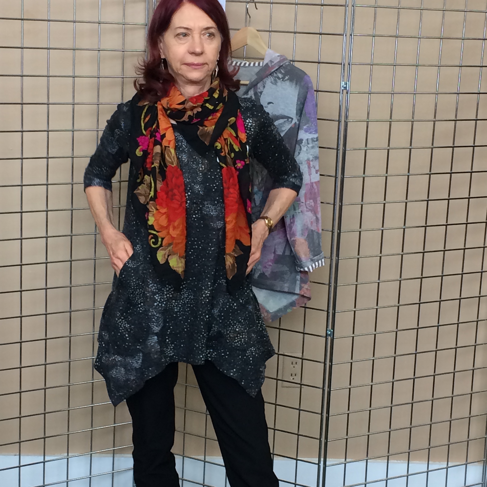 Kristin had fun mixing patterns with the Harriet Jacket from StyleArc in a scuba knit and Burda 6434 in a vintage silk print. The skirt is Simplicity 2058 in an activewear knit. Perfectly packable!