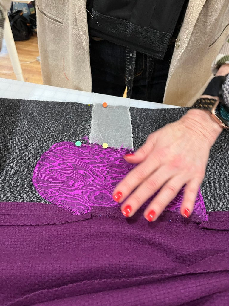 2. For October GSG I made view B from this pattern – short jacket with different collar – as a wearable muslin. This allowed me to tweak some fitting issues and focus on new and challenging construction techniques such as bound buttonholes, welt pockets, hem and facing lining, tabs and anchoring pockets while at the retreat. I learned so much!
