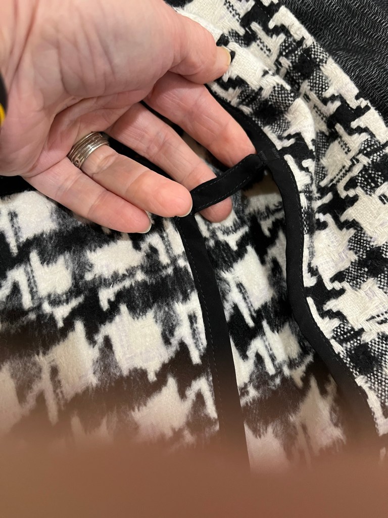 Both the pattern and the fabric have been calling out to me so I gave in and glad I did. I doubled the back yoke and installed with burrito method. The front pockets are constructed with a second backing piece so I doubled the front yoke while I was at it (it was one of the cold days 🙂 By this time I ran out of main fabric, had no lining that I wanted to use in the sleeves-because I couldn’t leave them single layer! So I used another wool that I had purchased to use with the main fabric. Very happy I did as the fabric show in the front band right up by my face!