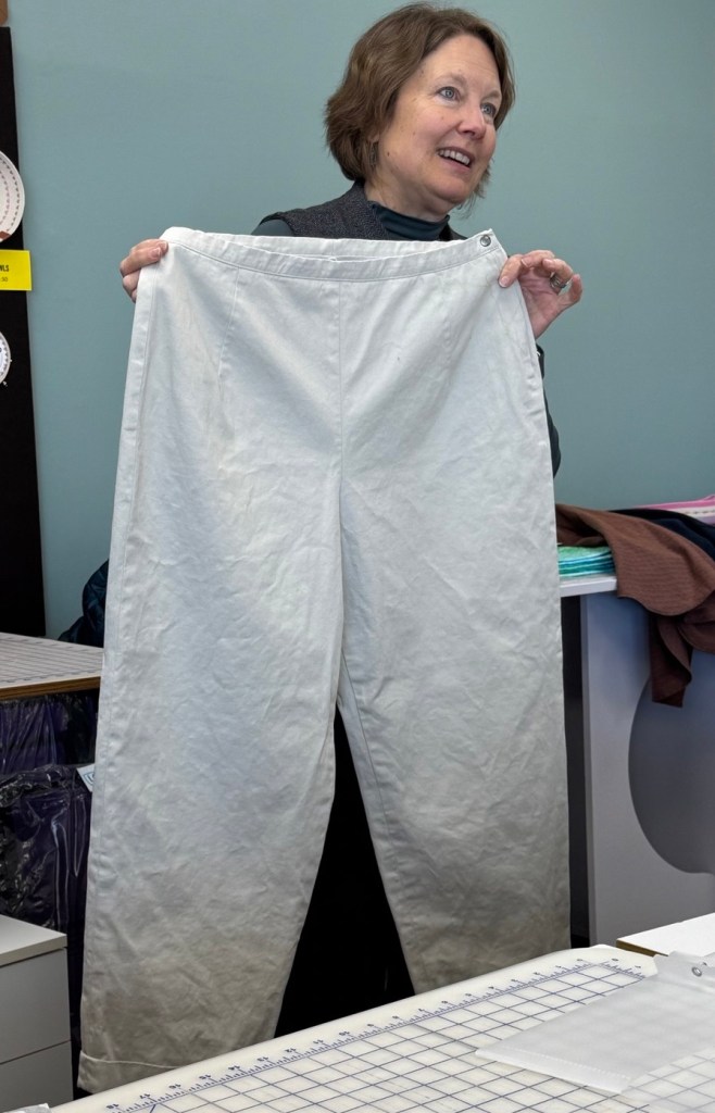 Pants can be boring but can feel pretty especially when bias binding is used on bottom edge of waistband.