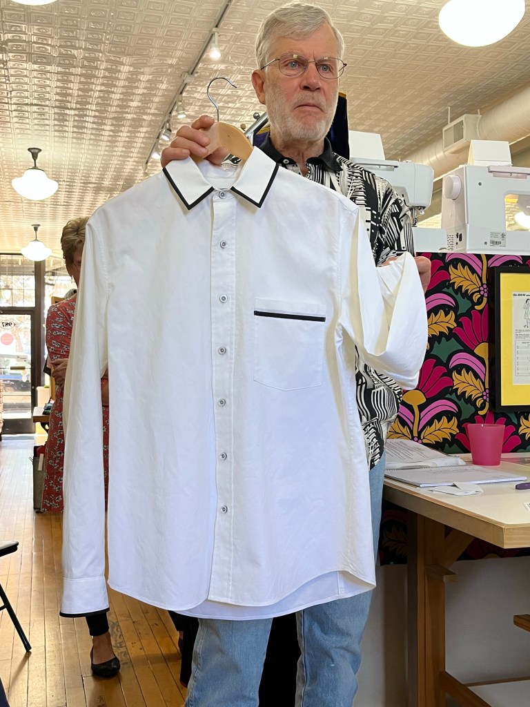 1. Pretty much to pattern in linen-other than the collar being half the height of the pattern, it is made to pattern. The front neck is rather low, the overlap at center front is 3” to accommodate large buttons. I think the combination of the low neck and overlap give the collar an asymmetric drape.