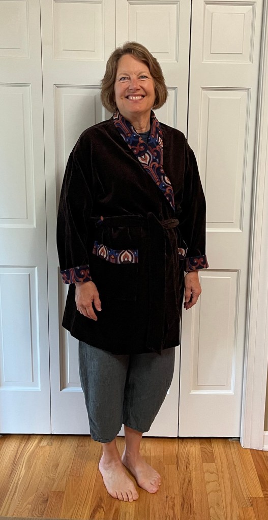 3. The eye opening came when I tried the robe on my husband-shawl collar and sleeves too short, waist and pocket placement too high. I had already gotten rid of the A-line of the side seams.