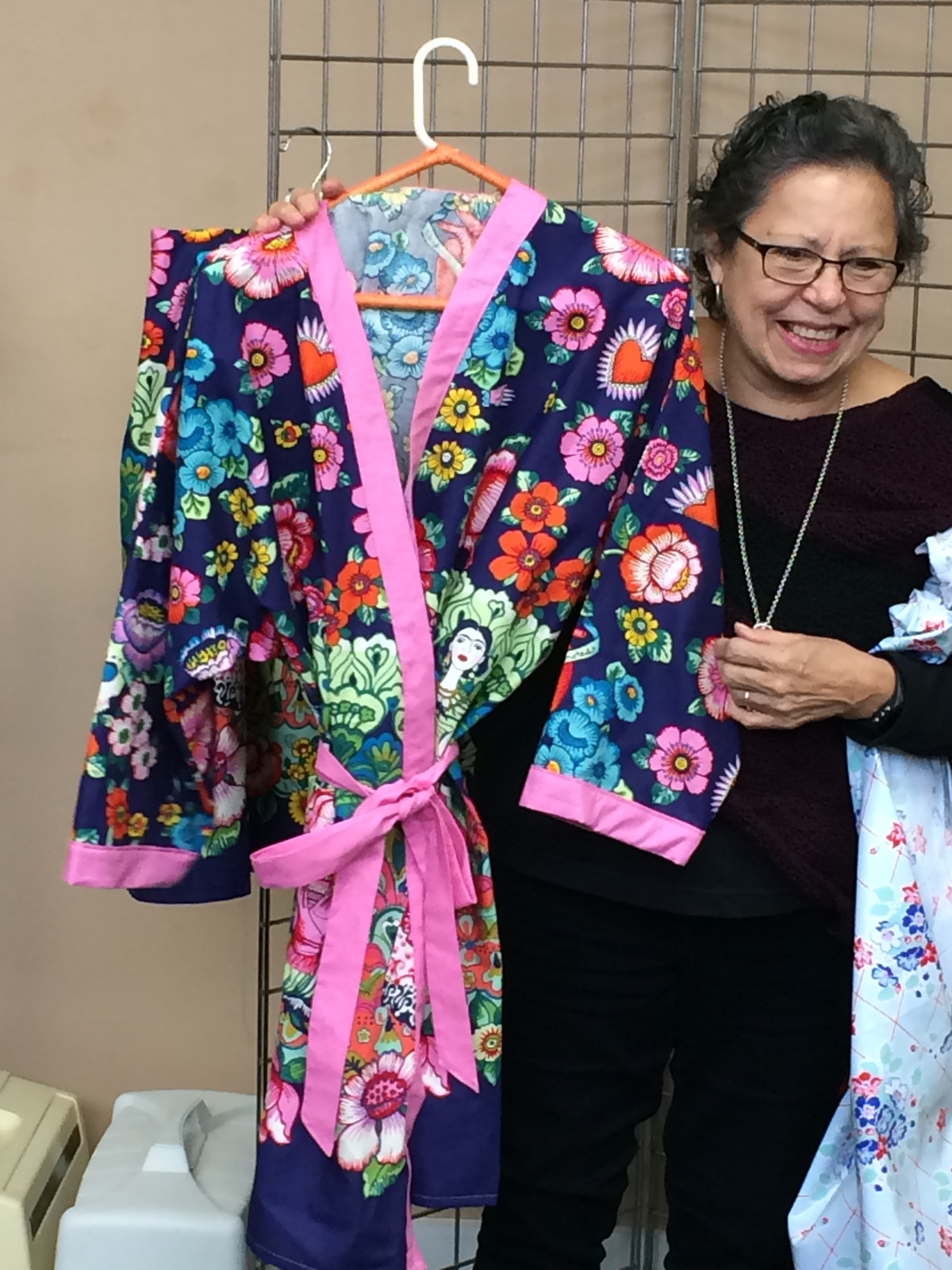 Louise has several new patterns and I don’t know about you, but I find that I don’t always visualize her designs well from the pattern pictures so seeing them made up is especially helpful. One of the other members of our group said the same thing so I don’t think it is just me. Her clothes were a mix of casual and more professional pieces using the same pattern but with changes in fabrics and colors. I am anxious to try “Snap to It” and “A New Angle“!