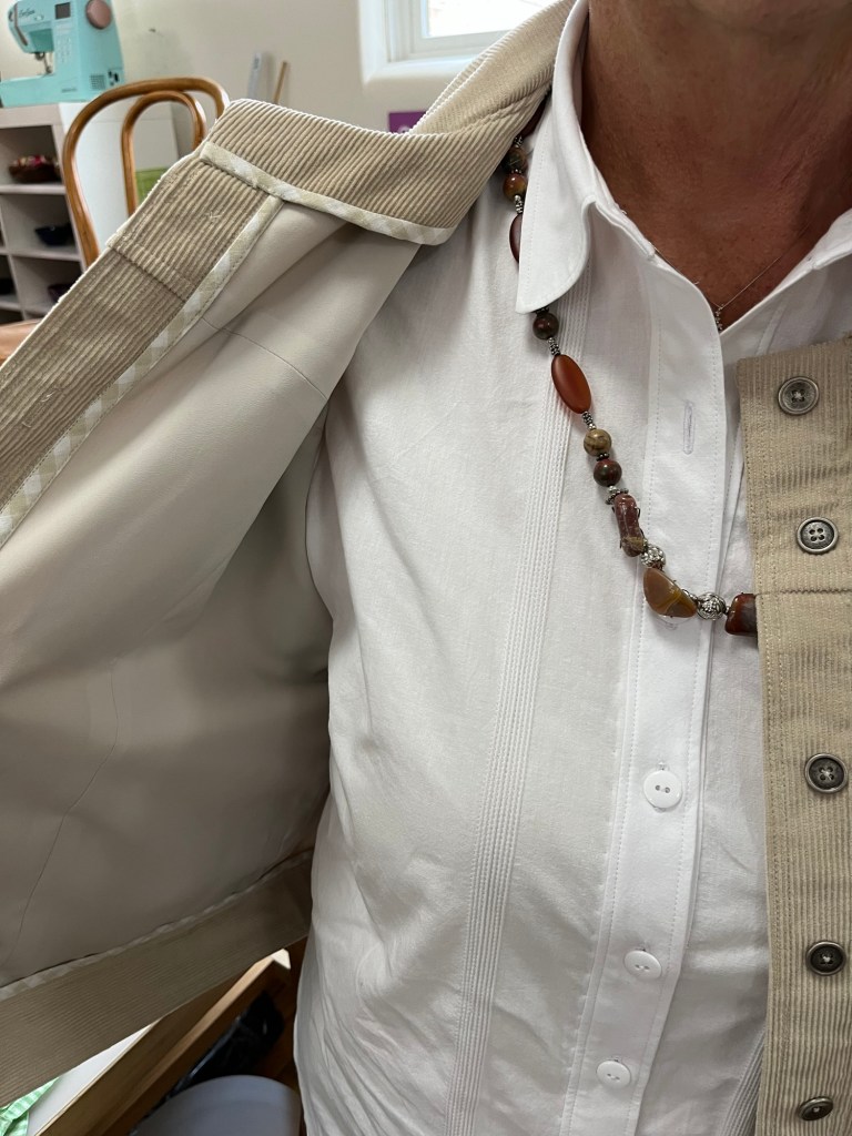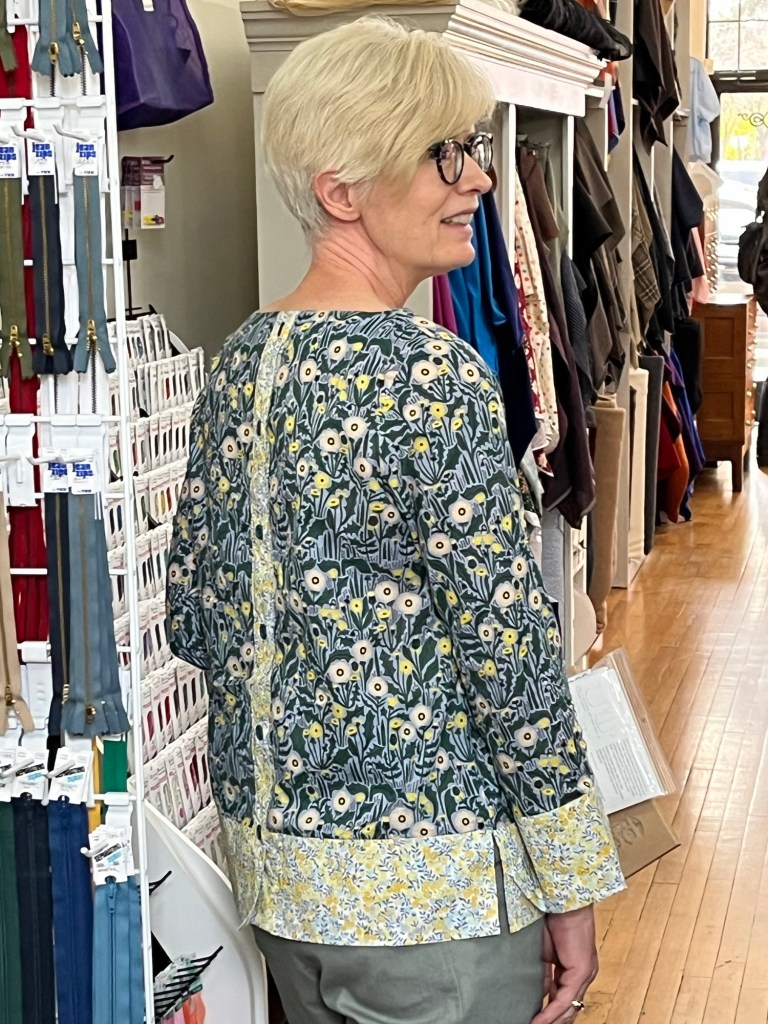 The long version of the Loren has been so fun to wear that I had to try it short (9.5” shorter 🙂 I purchased the extension pack (lining, sleeve and collar variations) and used the lining but still used the shawl collar.