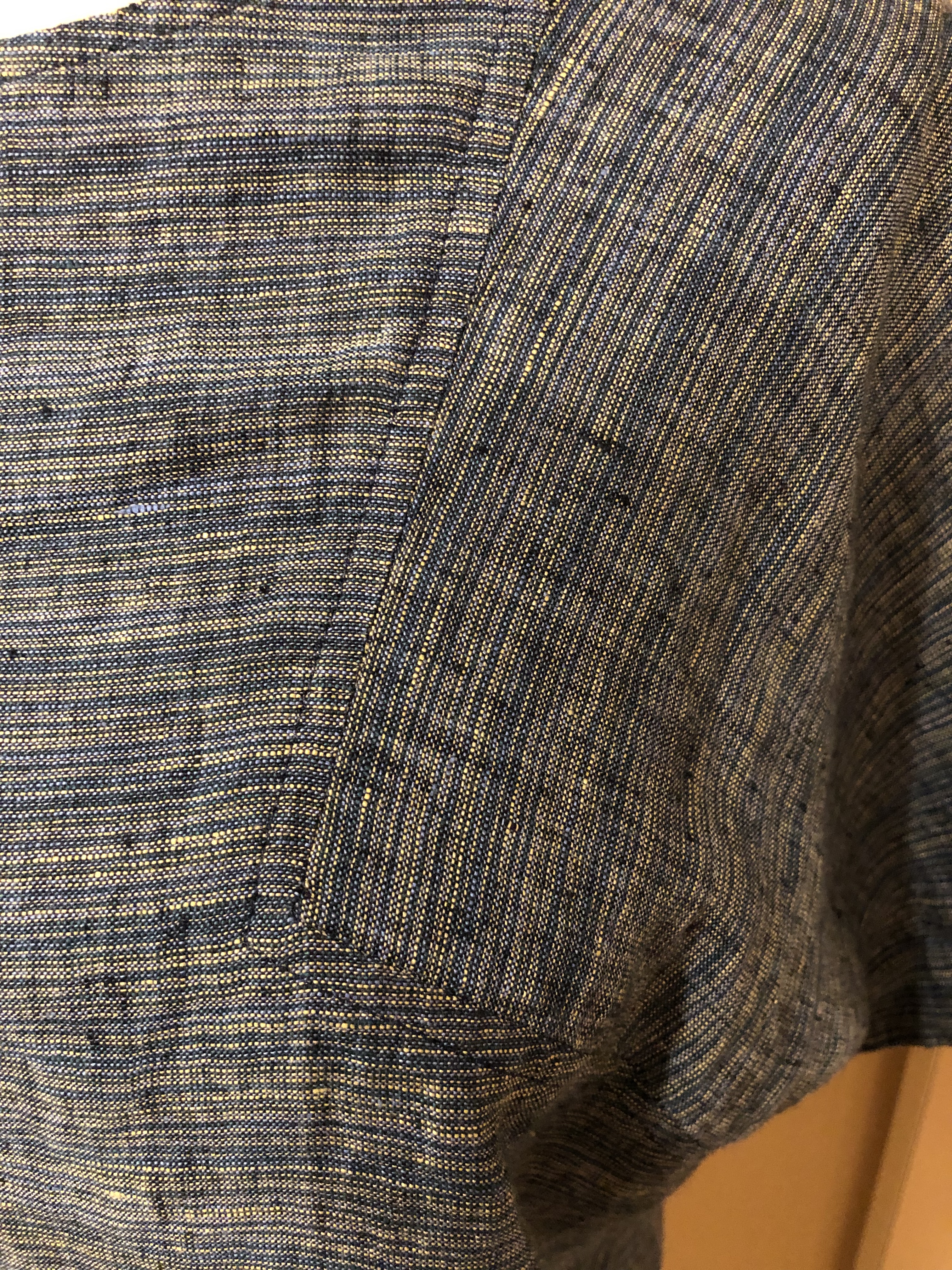 Double weave gauze (?) from where or when we don’t know, but it was the perfect fabric in Kristin’s stash to pair with a brocade-like lining to make the narrow sleeved kimono from Wiksten.