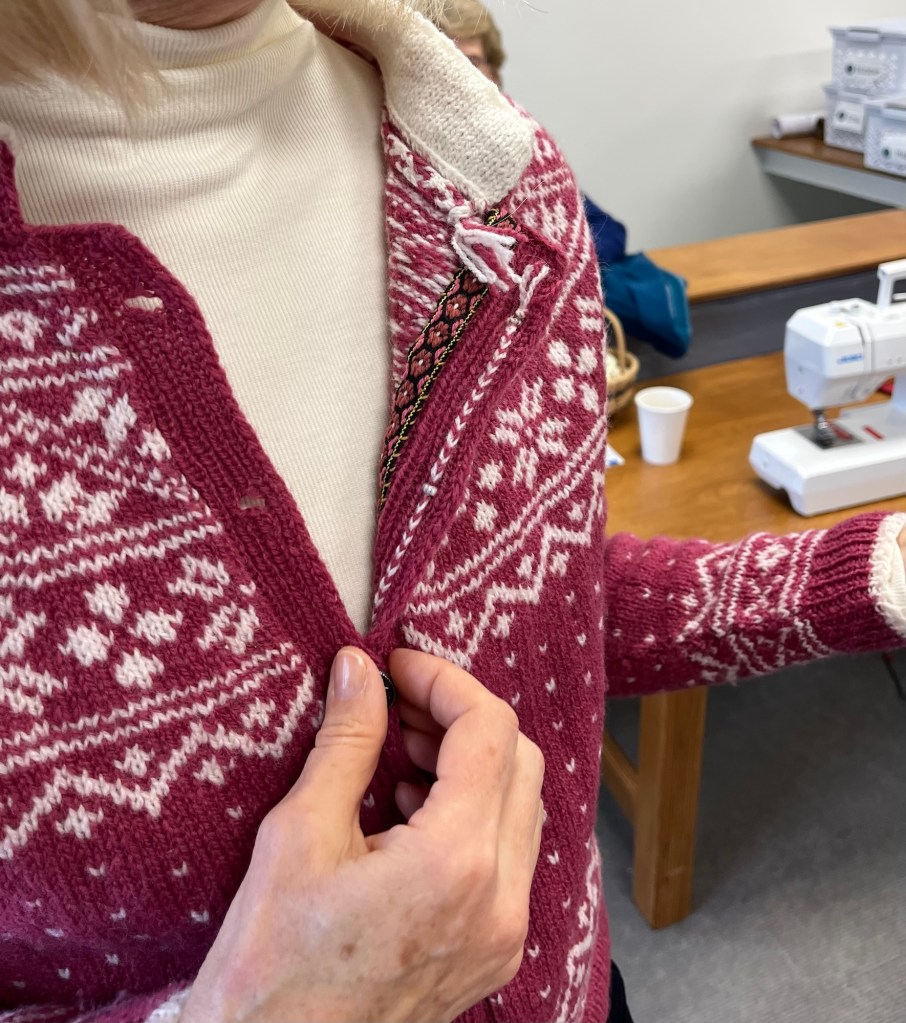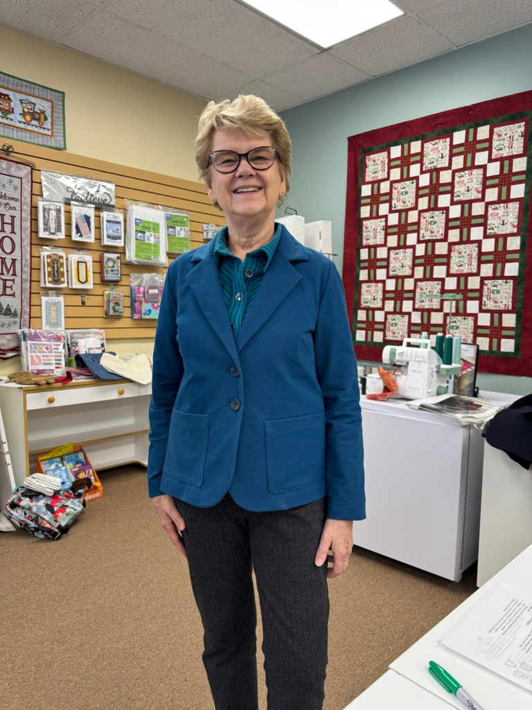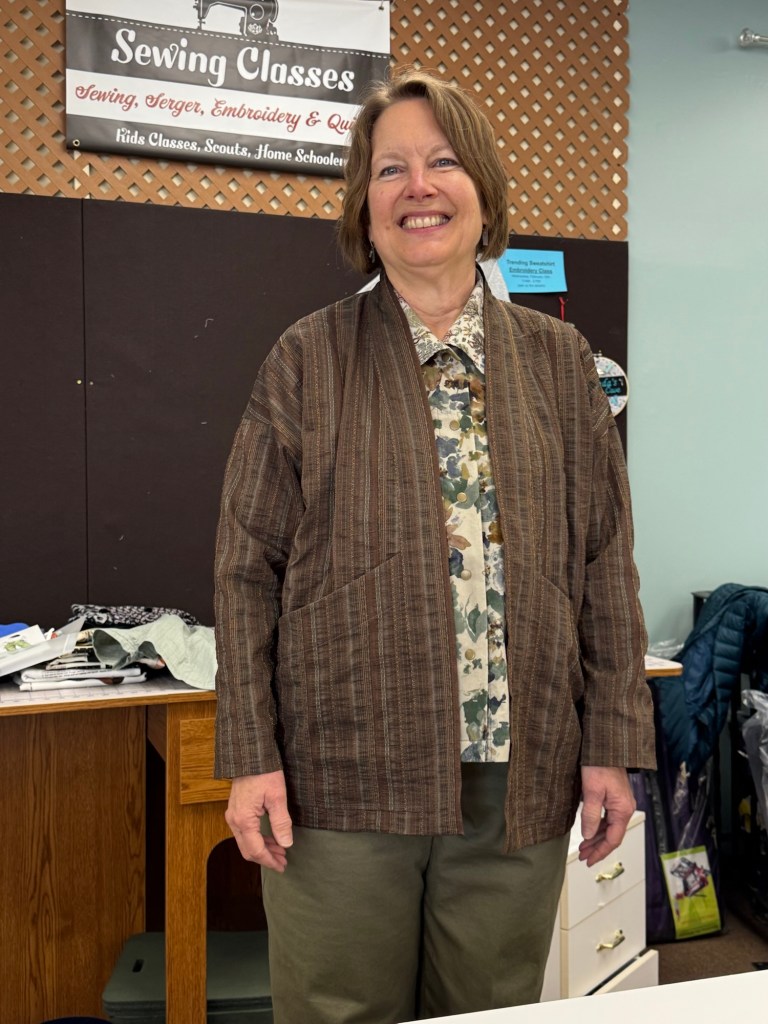 Unfortunately I read an article in the Winter 2024 Threads magazine titled Pattern Potential – A Guide To Evaluating and Choosing Wisely after I completed the jacket. The biggest problem with the pattern are the construction techniques. It would have been so much better to have a back neck facing and then sandwich the completed collar between the facings instead of sewing under collar to jacket and upper collar to facing and then sewing the two together. Also pressing under the facing shoulder seam and slip stitching to shoulder never a good idea – in my opinion!