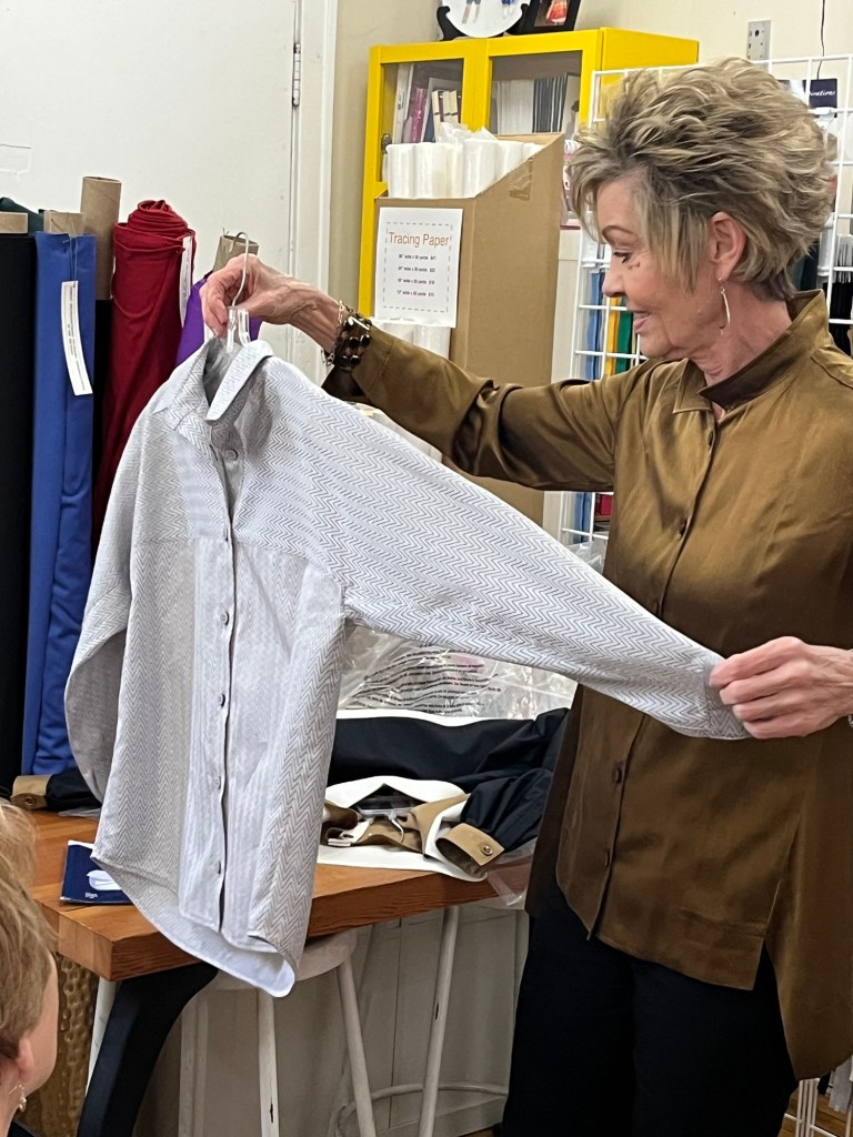 Fitting adjustments included petiting between shoulder and bust, narrowing shoulder and shortening body and sleeve length.