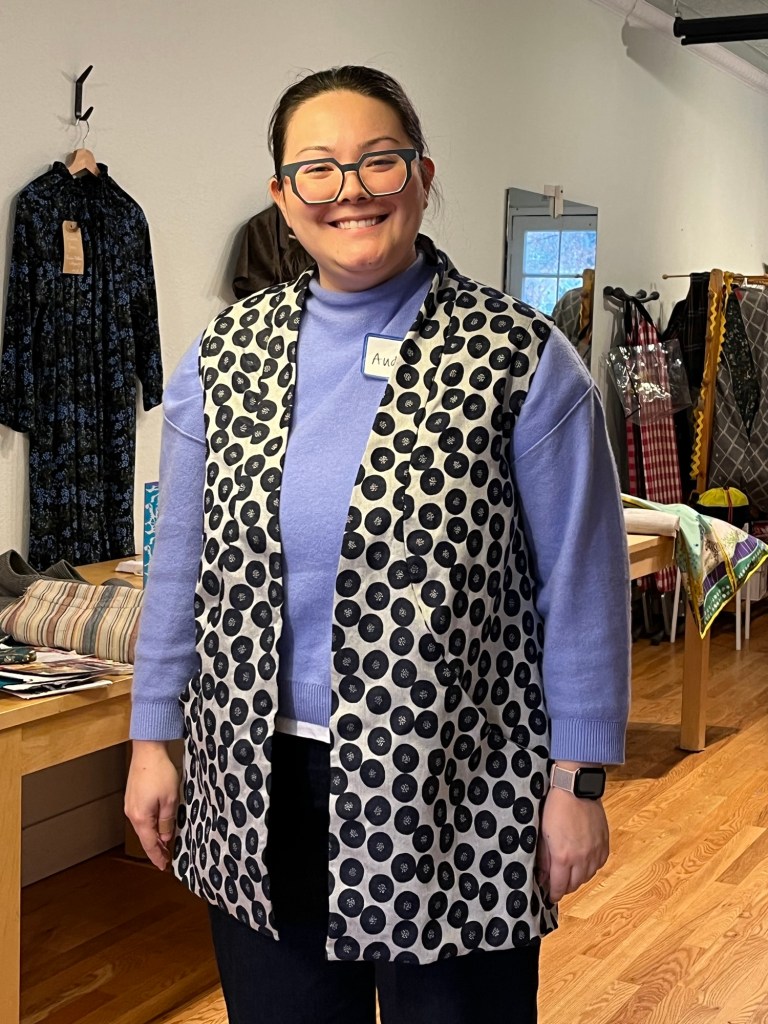 Love the fabric. The big pockets could get saggy. Underarm curve was tricky.