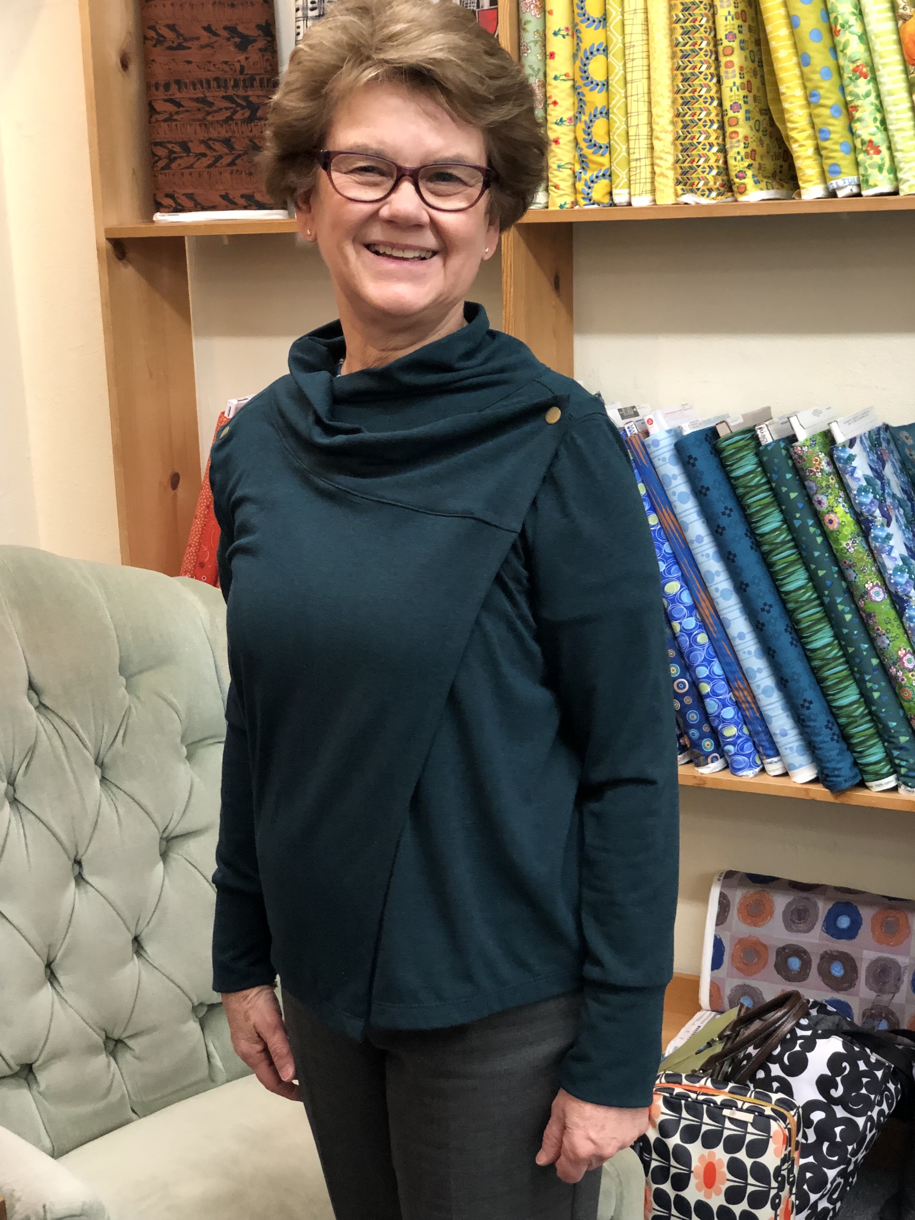 Drape/Snap Front Cardi-Heathered Jersey, Poly Viscose, spandex blend. Use your favorite Tee shirt pattern. * This was featured in FSC several years ago – but just in case here are the basics: