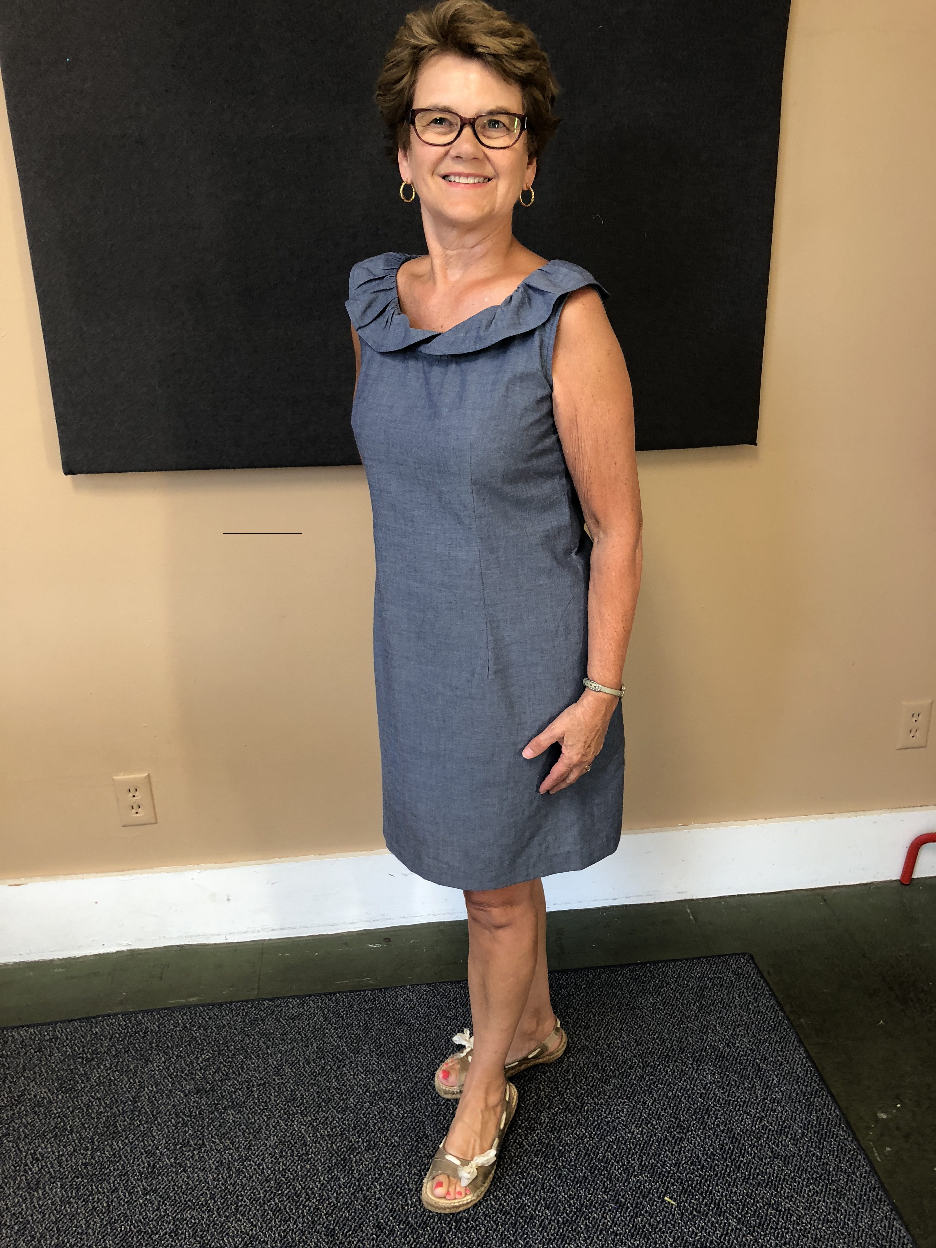 HB Ruffled Neck Sheath-McCalls 2401, Sleeveless with Squared V-Neck, Cotton Chambray