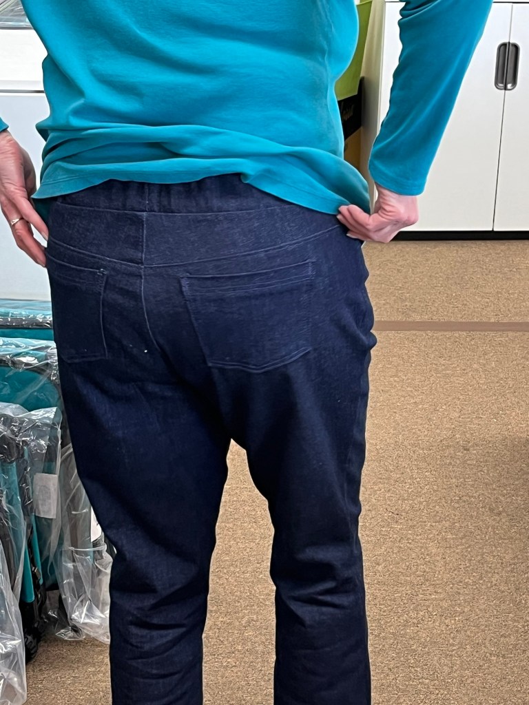 1. Fitting adjustments include shortening length 1 and 1/2 inches, narrow the leg width from my size at knee to smallest size at hem and straightening out hip curve. I also removed 1/4” from center back seam at waist for about 4 inches due to gapping.